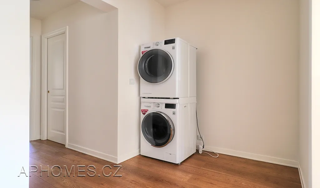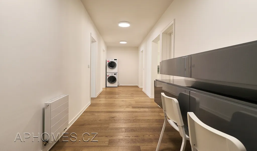 Součástí vybavení je kvalitní kuchyňská linka (digestoř, vestavěná trouba), myčka nádobí, lednice) a vybavení nábytkem dle fotografií. V rohu zadní části chodby je umístěna také pračka a sušička.