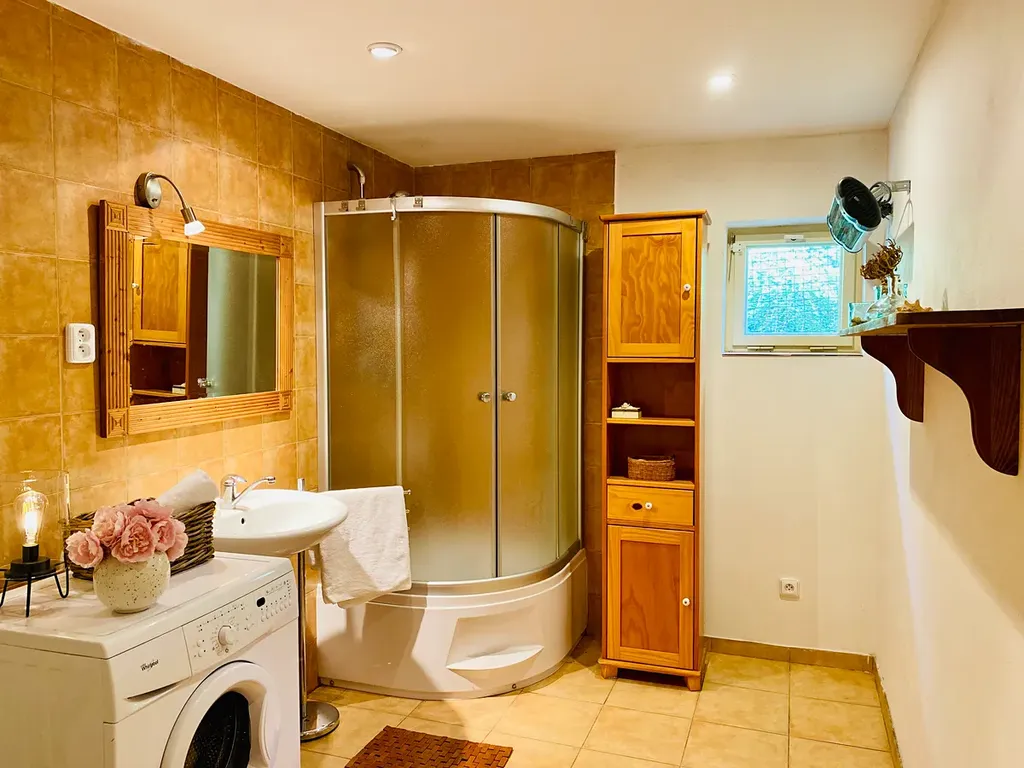 V přízemí se nachází útulná kuchyně, která přirozeně navazuje na světlý obývací pokoj s dominantními kachlovými kamny – srdcem celého domu, vytvářejícím neopakovatelnou atmosféru tepla a domova. Dále je zde koupelna, vstupní veranda a praktický dřevník s navazující kůlnou.