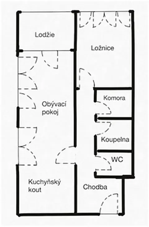 Byt je velmi prostorný, dispozice 2+kk celkem 76 m2 z toho velký obývací pokoj 35,7 m2 s plně vybaveným kuchyňským koutem (lednice, myčka, trouba, varná deska) a lodžií 4,5 m2, světlá ložnice 15,5 m2, chodba se zádveřím 10,7 m2, koupelna 4,2 m2, komora 3,4 m2 a toaleta 1,6 m2.