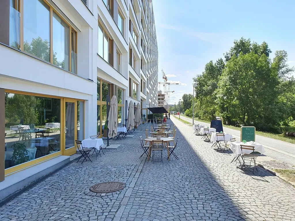 Pěkná klidná lokalita u Vltavy, u mostu do Holešovic, přitom minutu (250 m) pěšky od metra Křižíkova, kde se nachází veškerá občanská vybavenost. V samotném areálu (ne v tomto domě) se nachází restaurace a kavárny nabízející příjemné klidné posezení. PENB:B
