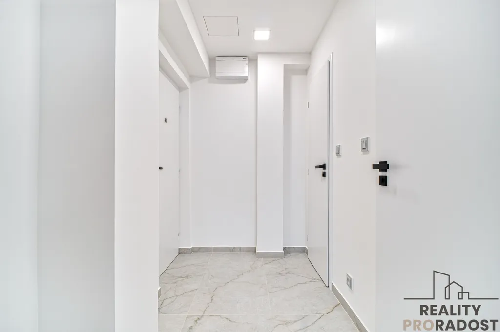 Kompletní rekonstrukce zahrnovala – celkovou změnu dispozice, novou elektroinstalaci včetně nového rozvaděče (vše má svůj vlastní okruh), vyzdění nového bytového jádra, kompletní rekonstrukci rozvodů vody, vytvoření ventilace, SDK podhledů, aplikaci keramické velkoformátové dlažby, instalaci sanity. Dále sjednocení nášlapových vrstev podlah v celém prostoru, aplikace sádrové omítky a výmalbu, instalace LED osvětlení, vypínačů a zásuvek ABB, instalaci kvalitní vinylové podlahy a keramické dlažby do chodby, koupelny a na toaletu, instalace interiérových dveří včetně kování v černé barvě a protipožárních vstupních dveří a dále instalace kuchyňské linky včetně spotřebičů.