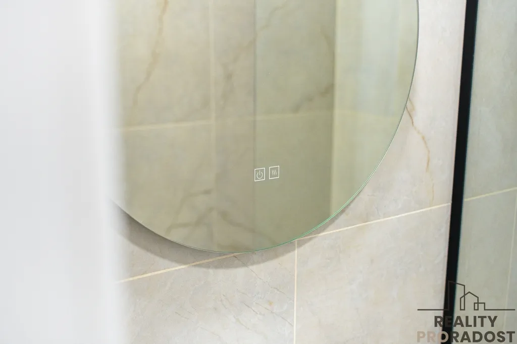 V koupelně se nachází walk-in sprcha, koupelnová skříňka vytvořená na míru ve stejném dekoru jako kuchyňská linka a zrcadlo s LED osvětlením. Toaleta je oddělená.
