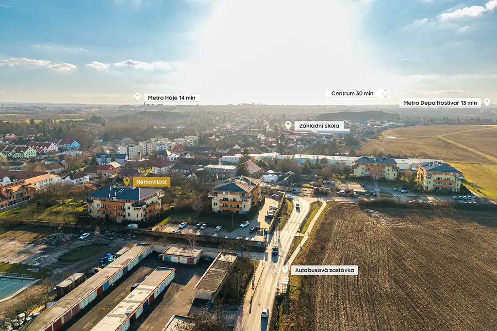 Například základní škola nebo Tesco Express jsou dostupná pěšky nebo 1 zastávka autobusu. Hned za domem začíná krásný přírodní park Říčanka, s dětským hřištěm, vodními prvky. Zastávka autobusu přímo u domu, do centra se dostanete MHD nebo autem do 30 min, 5 min autem do OC Štěrboholy.
