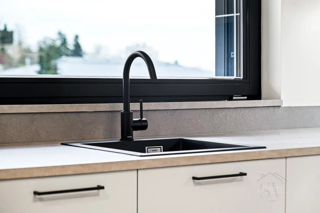 Kuchyň je vybavena špičkovými spotřebiči Electrolux (indukční deska, trouba, mikrovlnná trouba, myčka, vestavná lednice s mrazákem) a luxusním dřezem a baterií Blanco.