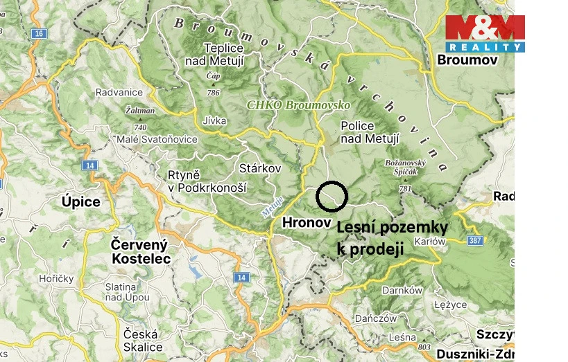 Prodej souboru pozemků v katastrálním území Vysoká Srbská u města Hronov, okres Náchod. Foto ilustrační. Součástí nabídky jsou zalesněné pozemky určené pro plnění funkce lesa a trvalý travní porost o celkové výměře do 26 000 m². Největší pozemky z nabízených tvoří funkční celek a mají výměru cca 20 000 m2. Celý soubor je vhodný jako dlouhodobá investice. Většina pozemků má přístup po komunikacích a částečně cesty sousedních vlastníků s dohodou užívání. Soubor obsahuje plochu pro uskladnění těžby, stáří porostu dle osnovy. List vlastnictví na vyžádání.
