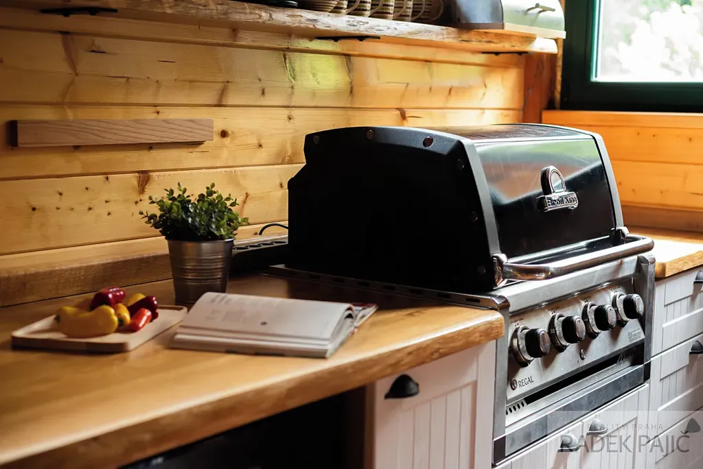 - Vnitřní pergola (25 m²) s kanadským plynovým grilem KingBroil, výčepem piva a vinotékou pro 80 lahví