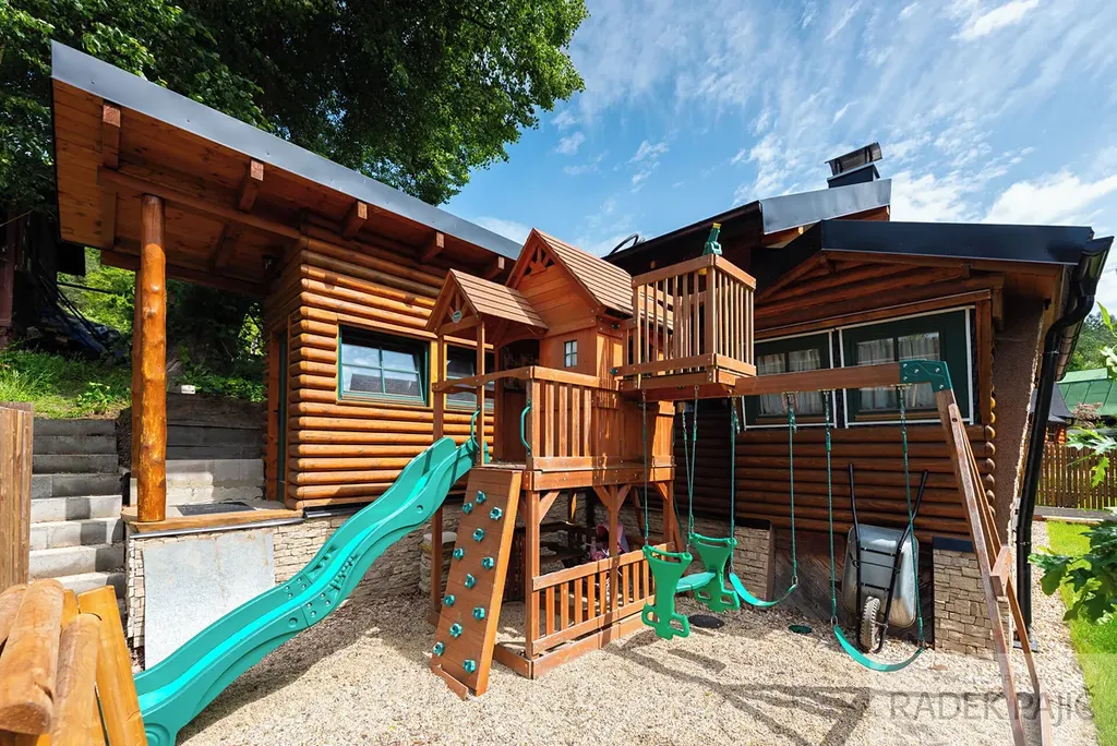 - Zahrada v rovině, zatravněná, s vyvýšenými záhony, dětským hřištěm a dřevníkem
