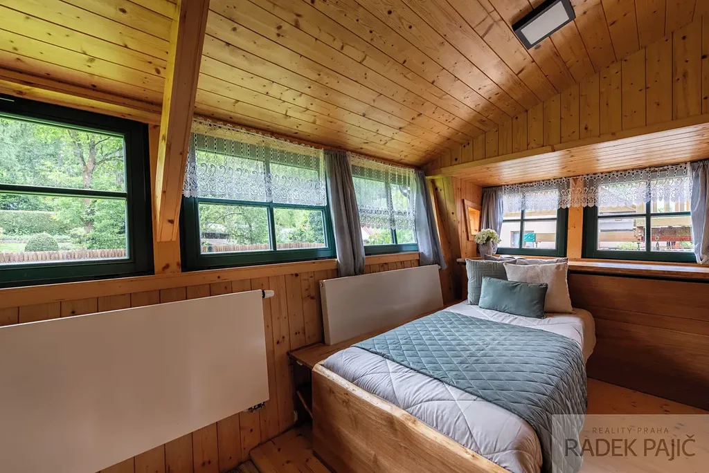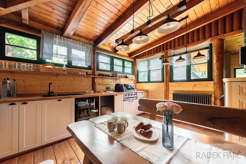 Prodej stylové chaty ve stylu srubu po kompletní rekonstrukci v trampské osadě Údolí Raků – klid, příroda a skvělá investice jen kousek od Prahy.