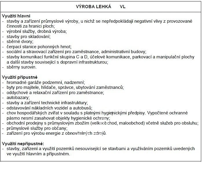 - stavby a zařízení průmyslové výroby, výrobní služby, drobná výroba, stavby pro skladování, sběrné dvory, ČSPH, sběrny surovin, parkování, hromadné garáže, autobazary, obchodní prodejny s průmyslovým zbožím, průmyslové služby pro občany, zařízení pro výrobu energie z obnovitelných zdrojů, a další.