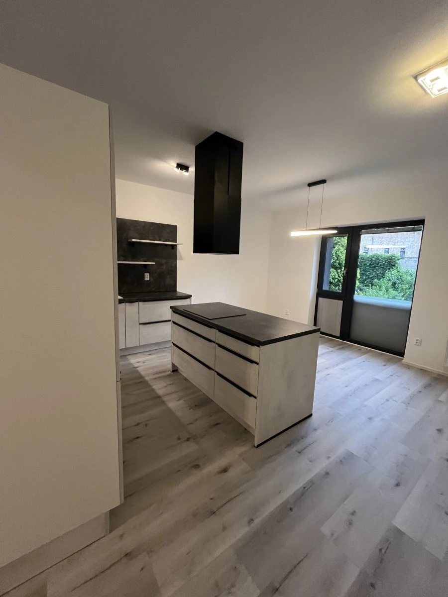 Dominantou bytu je velká kuchyňská linka s vestavěnými spotřebiči (trouba, varná indukční deska, myčka, lednice, mikrovlnná trouba) , velmi dobře prosvětlený obytný prostor s krásným výhledem do vnitrobloku nabízí dostatek místa pro sedací soupravu, televizní stěnu, jídelní stůl se židlemi.