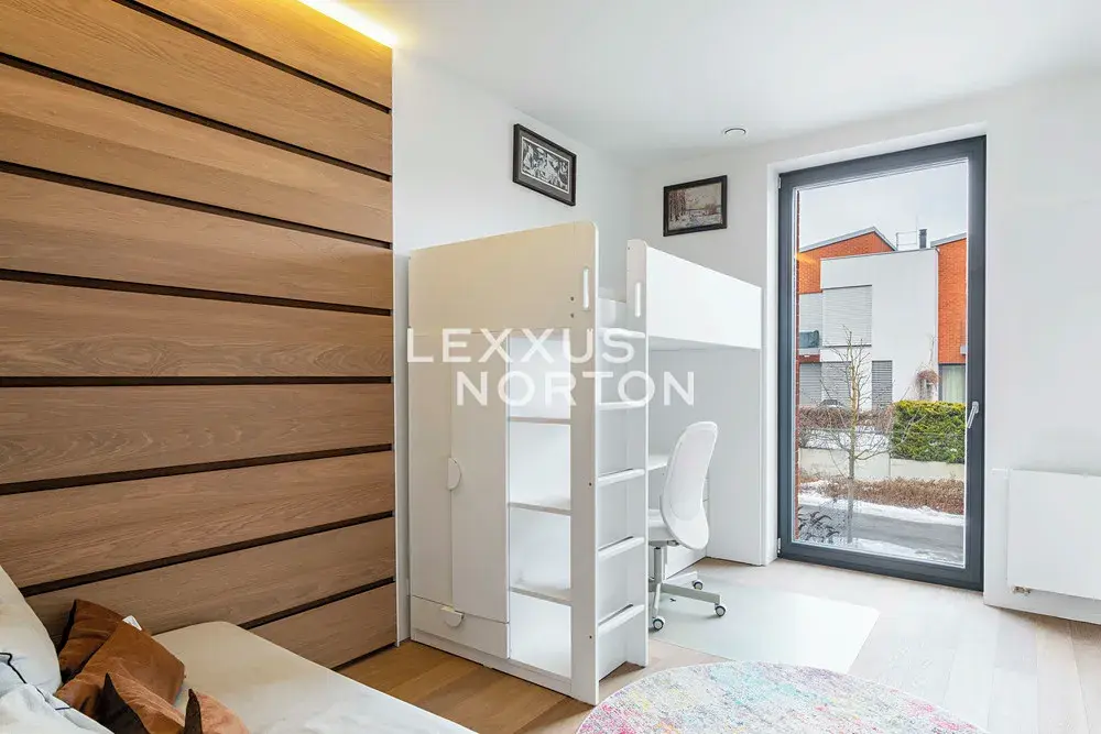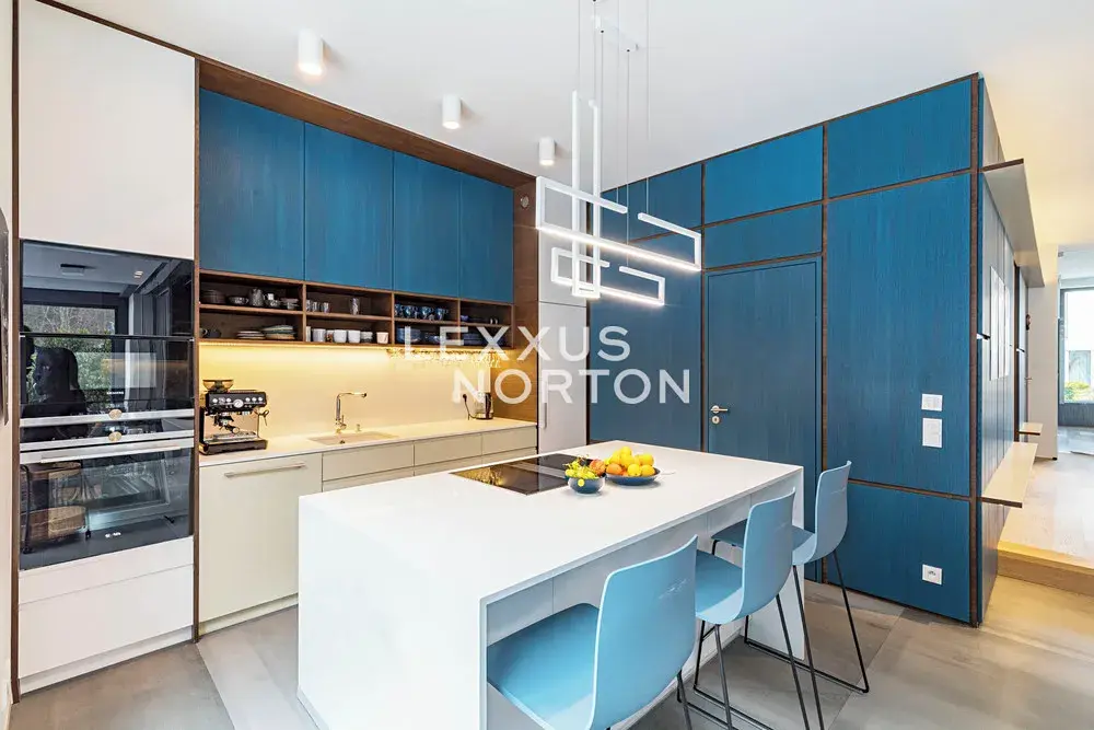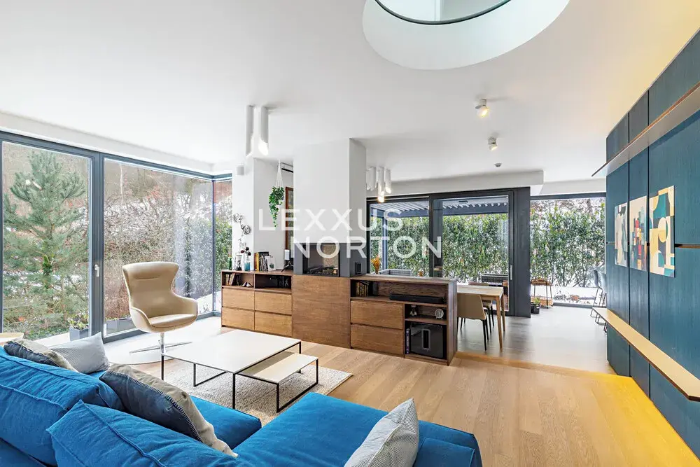 V suterénu je vybudován samostatný apartmán s kuchyňskou linkou a koupelnou, se vstupem do zahrady – ideální pro hosty, chůvu či vícegenerační bydlení. Dále zde naleznete technické zázemí, komory a přímý vstup do garáže s vyhřívaným vjezdem a dvěma nabíjecími stanicemi pro elektromobily.