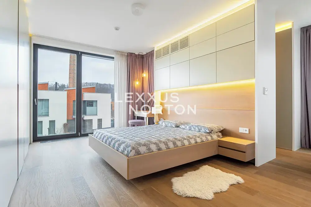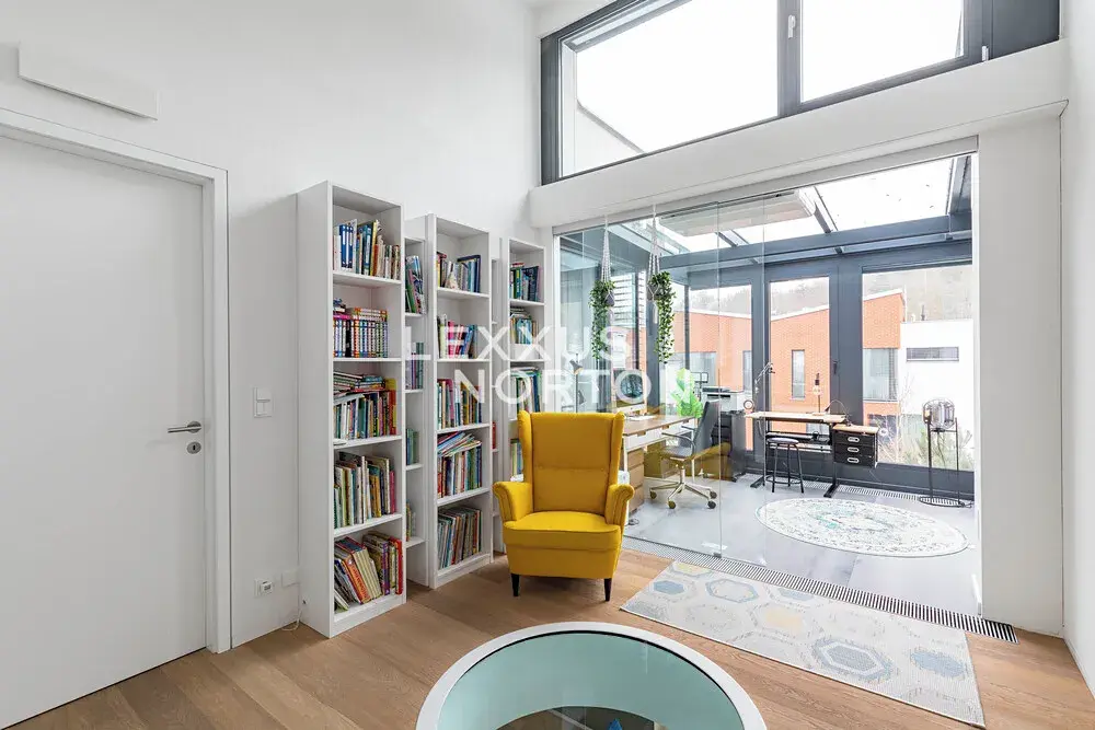 V patře se nachází hlavní ložnice s vlastní šatnou a luxusní koupelnou s vanou i sprchovým koutem, dvě další ložnice, druhá koupelna a klidová hala ideální pro relaxaci. Středem domu prochází kruhový světlík, který přivádí denní světlo až do přízemí. Výjimečným prvkem je zimní zahrada o výměře 9,21 m² vhodná jako pracovna, ateliér nebo soukromý lounge.