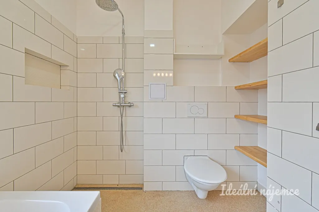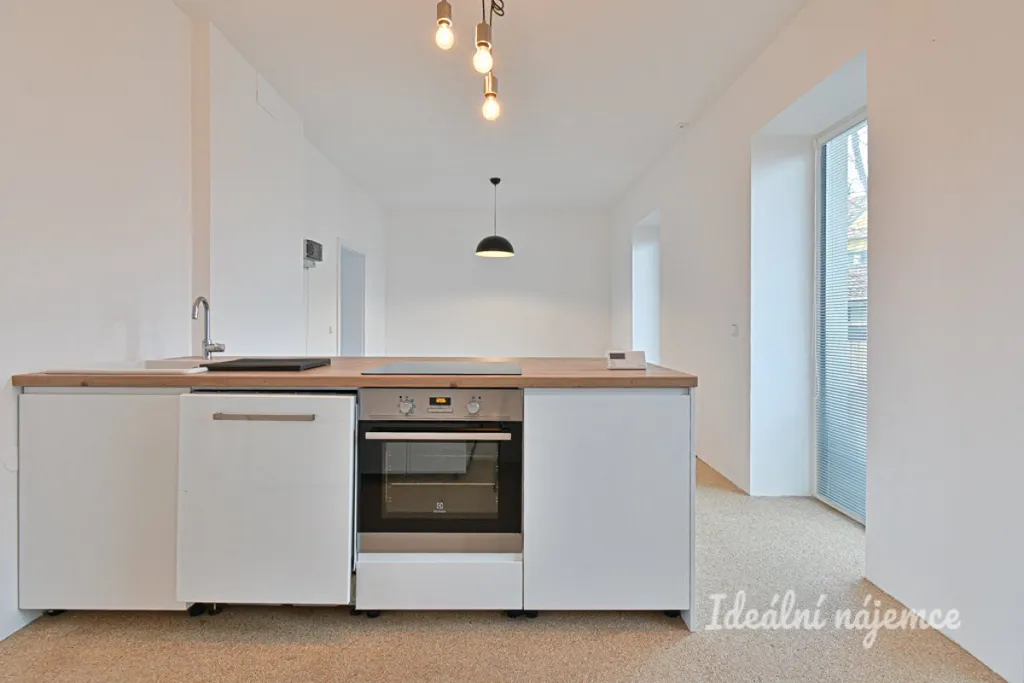 Byt se nabízí částečně vybavený. Kuchyně disponuje myčkou, elektrickou troubou, varnou deskou a digestoří. Obývací část je nezařízena. Další dva pokoje jsou ponechány nezařízené. V koupelně je vana, sprchový kout, umyvadlo, toaleta a pračka.