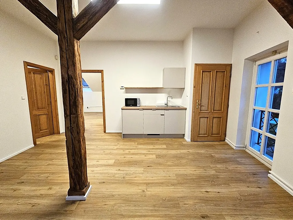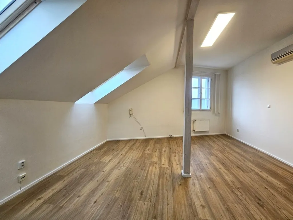 Prostor sestává ze vstupního schodiště (8,21 m2), 4 průchozích místností (22,51 m2, 16,77 m2, 9,07 m2, 13,23 m2), koupelny s WC (7,92 m2) a 1 neprůchozí místnosti, ve které je i klimatizační jednotka (26,28 m2). Prostor je nezařízený nábytkem. K dispozici je nová kuchyňská linka s novými spotřebiči – indukční vařič, lednice a mikrovlnná trouba. V prostorné koupelně je umývadlo, WC, vana i sprchový kout. Topení je ústřední - společný kotel pro celý dům, který se ovládá samostatným termostatem nainstalovaným v prostoru. Prostor je možné mít zabezpečený alarmem od společnosti Jablotron, který je napojený na CPO a to za 400 Kč měsíčně. Parkování je možné pro 2 auta na přilehlém pozemku před domem za 1.450 Kč měsíčně / 1 auto.