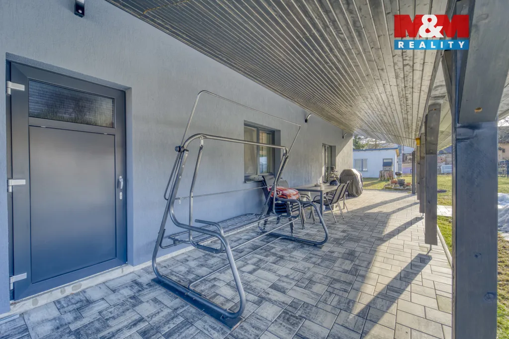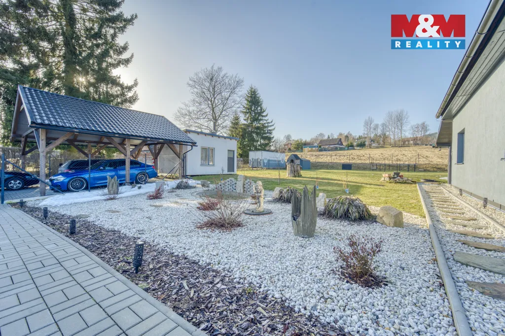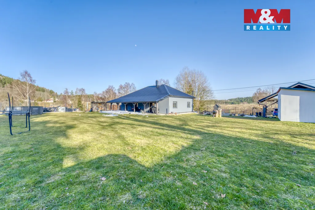 Na zahradě najdete krytou terasu 41 m², bazén, jezírko, celoročně využitelnou chatu s krbovými kamny, i zahradní domek. Parkování pro 4 auta je zajištěno pod přístřeškem. V pěší vzdálenosti je škola, školka, lékař, městský úřad, fotbaliště, sportovní hala, jezírko, pumptrack i areál zdraví. Za zmínku stojí i slavný skalní útvar rotavské varhany. Dům je bez nutných investic.