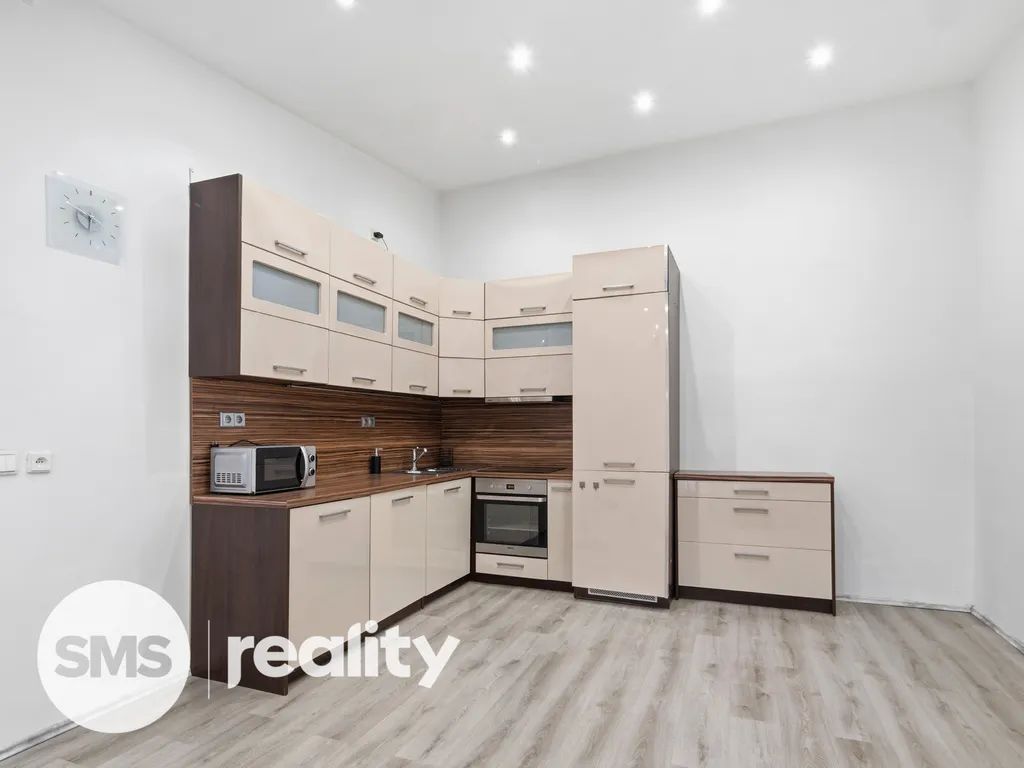 Nemovitost je nabízena plně vybavená, což umožňuje okamžité nastěhování bez dalších investic. V ložnici najdete šatní skříně, dvojlůžko a komodu, koupelna je vybavena pračkou. Obývací pokoj disponuje rohovou sedací soupravou, konferenčním a televizním stolkem. Kuchyňská linka je kompletně vybavena spotřebiči – troubou, varnou deskou, digestoří, mikrovlnnou troubou a lednicí.