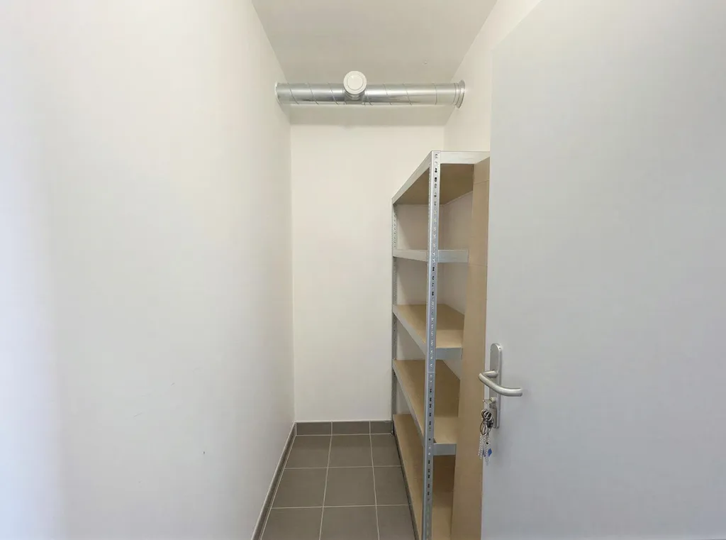 Velkou výhodou je chytře řešená vstupní chodba s vestavěnou skříní vyrobenou na míru až ke stropu, která poskytuje nadstandardní úložný prostor. Součástí je také praktický botník s věšáky a zrcadlem. Koupelna je moderně zařízená a disponuje sprchovým koutem, umyvadlem se skříňkou, toaletou a připraveným místem pro pračku.