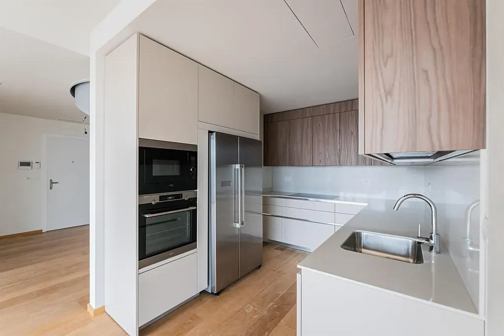 Součástí vybavení bytu patří klimatizace, pračka, sušička, podlahové topení, kvalitní dubová podlaha. K dispozici je sklep a parkování v garážích.