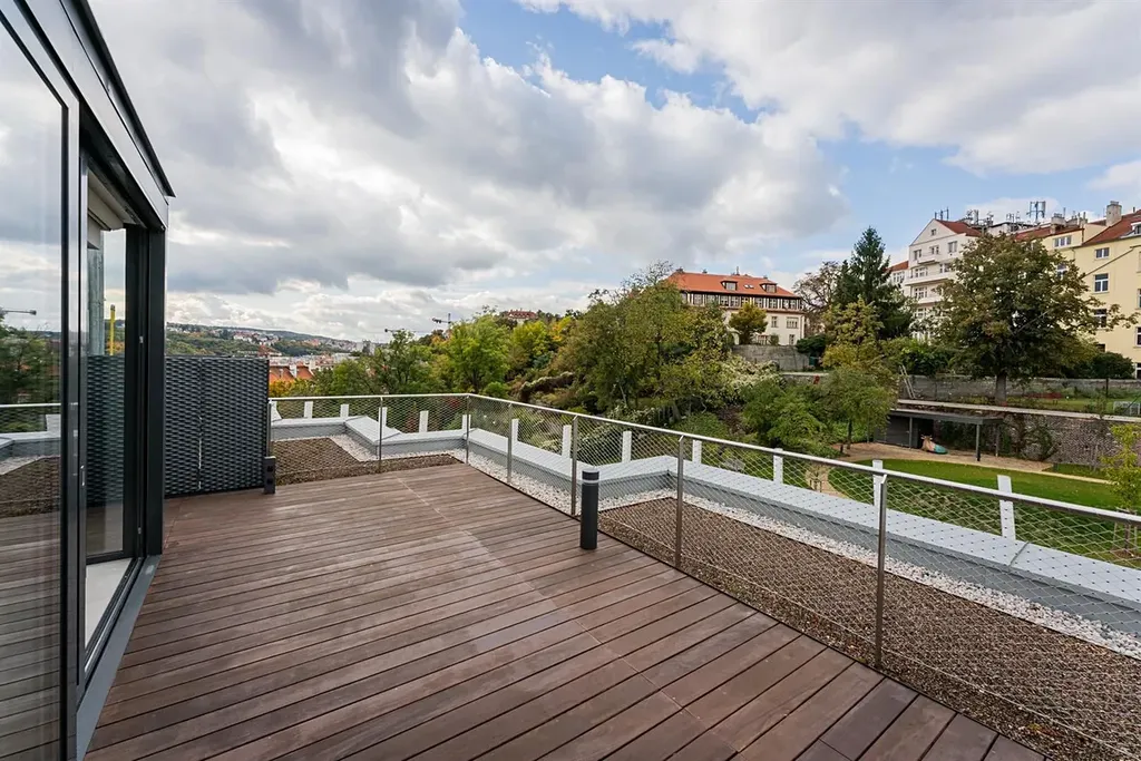 Luxusní nadstandardní moderní mezonet 5+kk (4 ložnice, 3 koupelny), s vlastním wellness & saunou, třemi terasami (28,24m2, 27,22m2, 25,5m2), zahradou 30,76 m2, celkovou obytnou plochou 211,7 m2, se nachází v 6. a 7. (posledním) patře v luxusním, v moderním rezidenčním komplexu s výtahem, recepcí, bazénem, saunou, prostornou zahradou ve dvoře, sklepem a možností parkování v podzemním parkovišti.