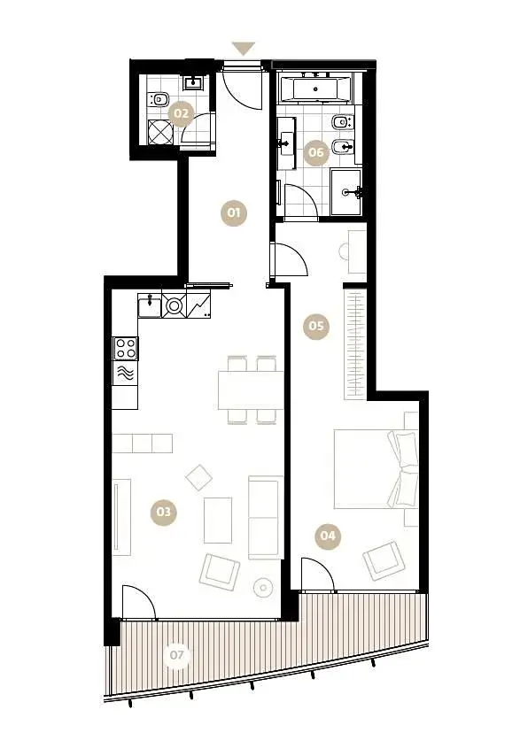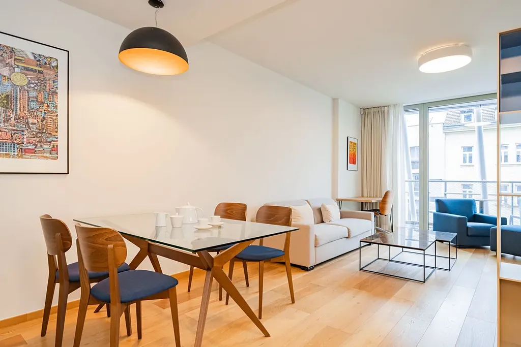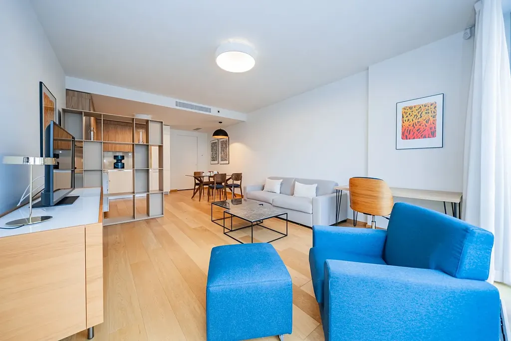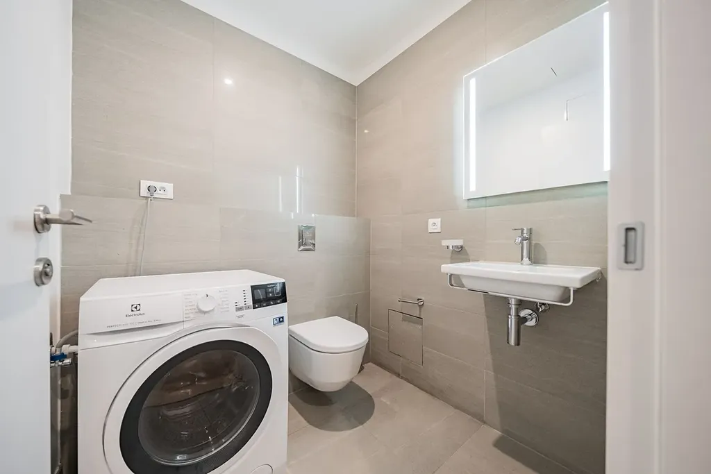 Moderní, plně zařízený byt 2+kk (1 ložnice, 1 koupelna), s terasou (11,48m2) a celkovou plochou 89,58m2, je situován ve 3. NP zcela nového luxusního rezidenčního komplexu s výtahem, recepcí, bazénem, saunou, prostornou zahradou ve dvoře, sklepem a možností parkování v podzemním parkovišti.