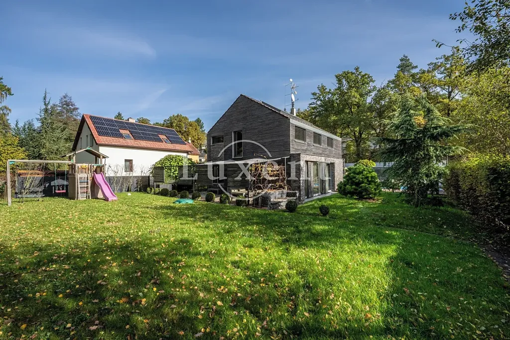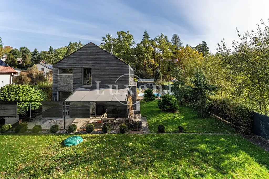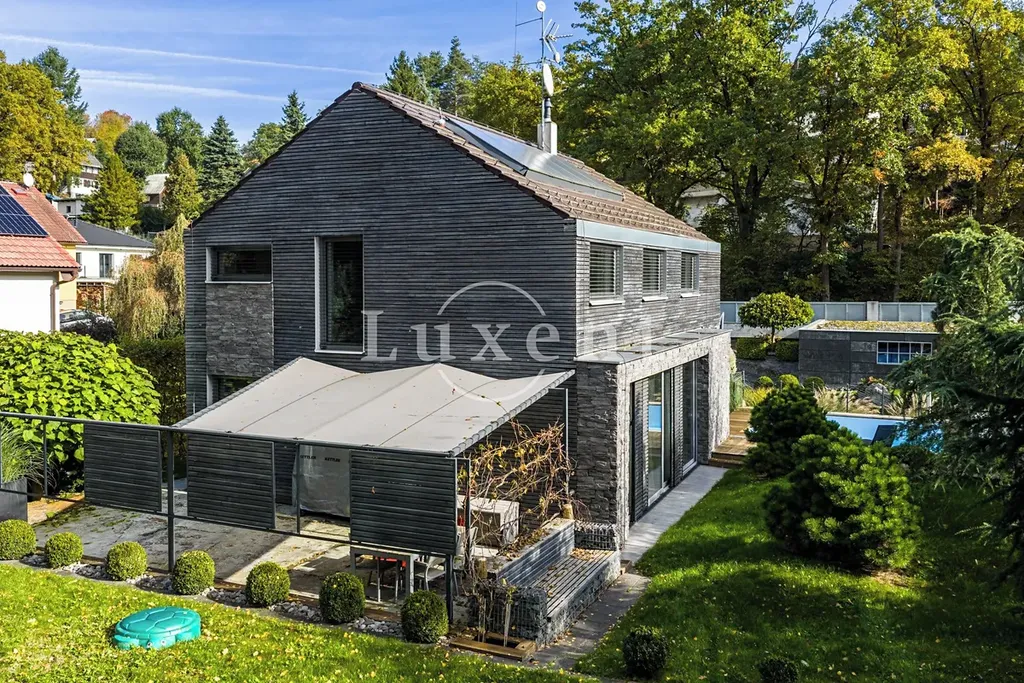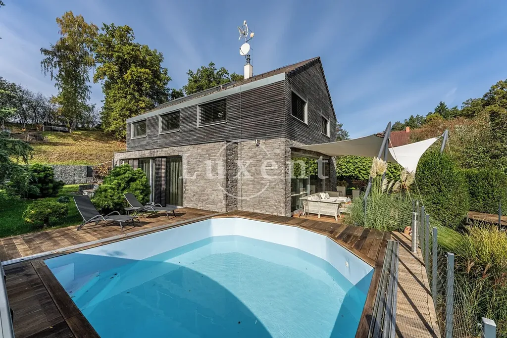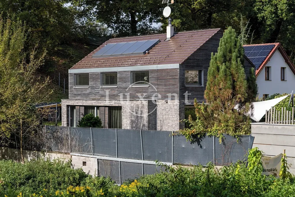 Nabízíme k prodeji dvojpodlažní rodinný dům 5+kk s celkovou užitnou plochou 185 m², který byl postaven v roce 2011. Dům představuje architektonicky nápaditě řešené moderní bydlení, které je citlivě zasazené do malebné okolní přírody Hrusic. Jihovýchodně orientovaná vila důmyslně pracuje se všemi živly: vodu představuje venkovní bazén a potůček na pozemku, rozlehlá zahrada poskytuje zemi, vzduch proudí velkými okny a dveřmi, oheň je zkrocen v krbu.