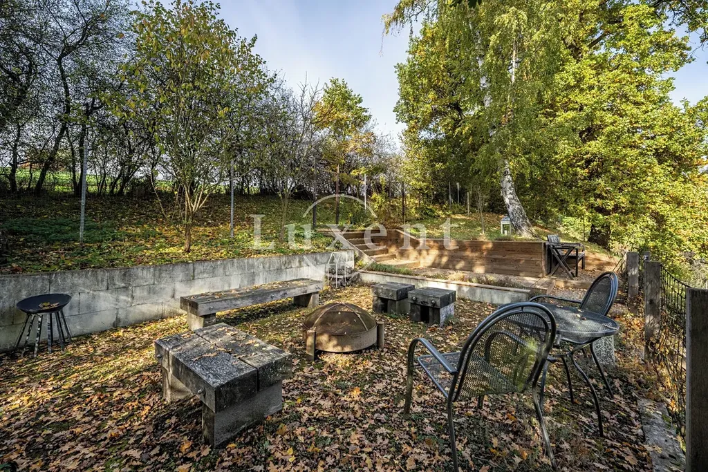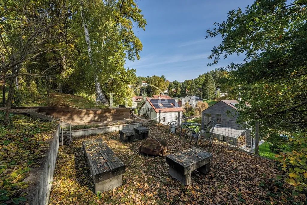 V zadní části domu je druhá terasa se stíněním, vhodná například ke grilování a na ní navazuje volný prostor zahrady. Svah u zahrady je využitý jako bezúdržbová část zeleně a schodiště nás dovede do horní části, kde se nachází ohniště s překrásným výhledem do okolí.