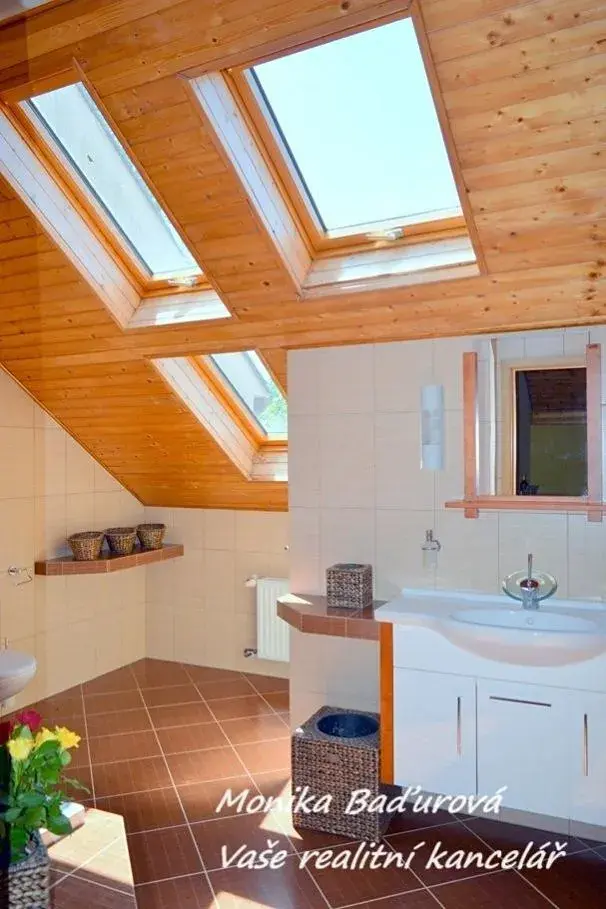 Druhý byt má dispozici 2+kk, v přízemí se nachází obývací pokoj s krbem a moderním kuchyňským koutem, ke kterému přiléhá terasa s nádherným výhledem do zahrady. V podkroví se nachází velká ložnice se šatnou a zajímavě řešenou koupelnou. Tento byt je kompletně zrekostruován.