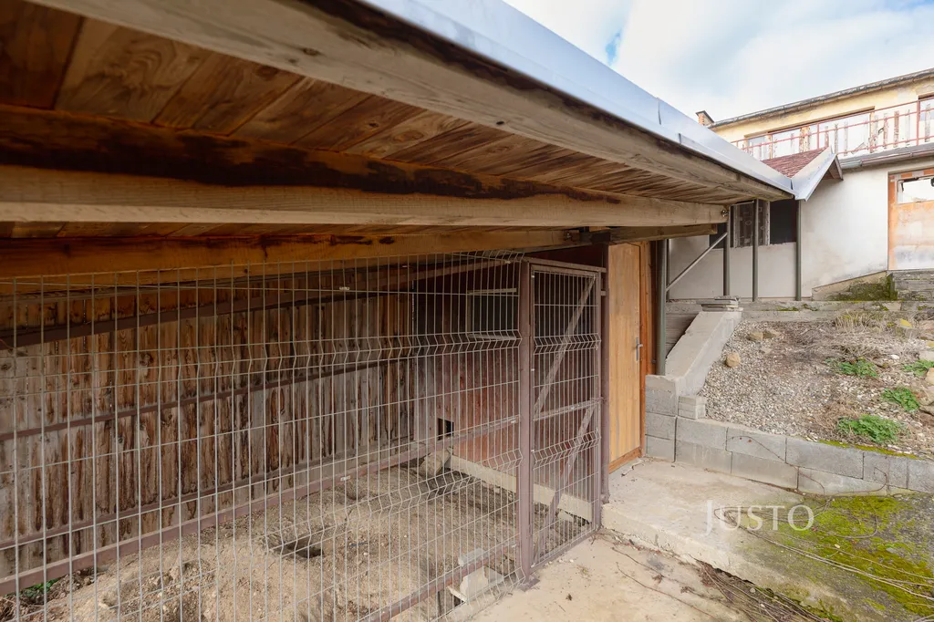 Na zahradě jsou vybetonované přístřešky na skladování materiálu a chov domácího zvířectva.