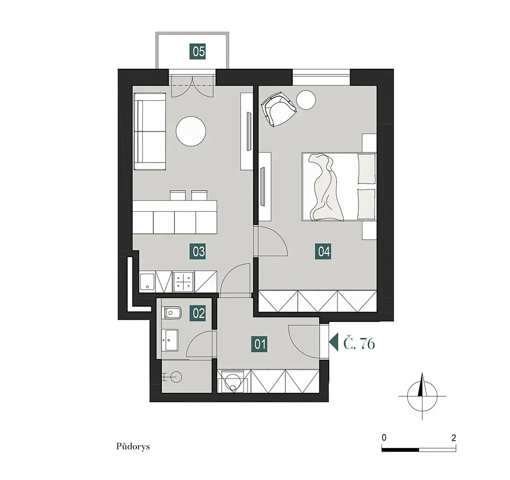 Půdorys severně orientované jednotky do klidného vnitrobloku v 7. podlaží zahrnuje obývací pokoj s přípravou na kuchyňský kout, prostornou ložnici, koupelnu se sprchovým koutem a toaletou a chodbu s dostatkem místa na vestavěné skříně. K jednotce náleží také balkon s výměrou 1,9 m² sklepní kóje o velikosti 2,3 m².