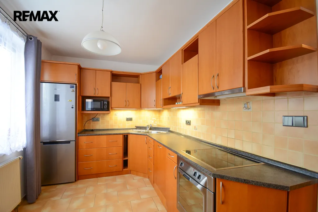 Kuchyň je vybavena sklokeramickou varnou deskou, elektrickou troubou, digestoří, myčkou nádobí a volně stojící lednicí. Nechybí ani prostor pro menší jídelní stůl. Byt působí velmi příjemně a díky své dispozici nabízí dostatek místa jak pro pár, tak menší rodinu.