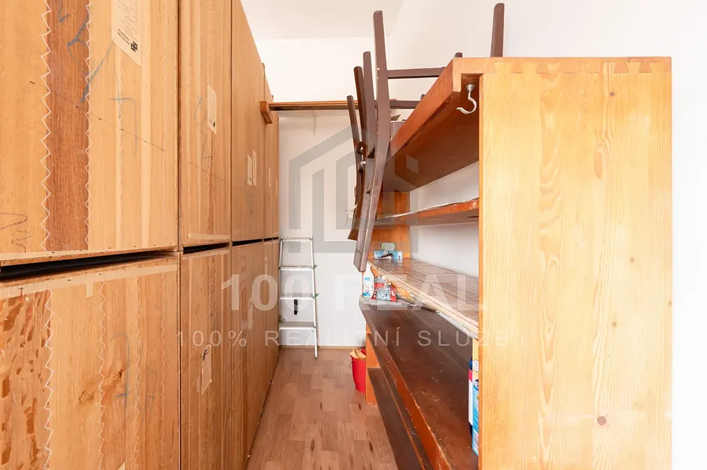 - pokoj + kuchyň — kuchyňská linka, dvou plotýnková varná deska, el. trouba, mikrovlnná trouba, toustovač, rychlovarná konvice, lednice, jídelní stůl se 4x židlemi, TV, pracovní stůl s 1x židlí, obývací stěna, komoda, konferenční stolek, rozkládací gauč, za obývací stěnou — prostor s regálem a sušákem na prádlo (37,8 m²)