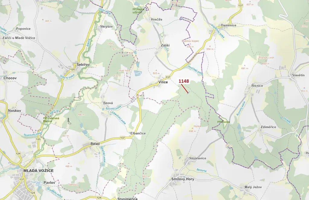 Lesní pozemek o výměře 1105 m2, parcelní číslo 1148, podíl 1/1, katastrální území Vilice, obec Vilice, obec s rozšířenou působností Tábor, okres Tábor, Jihočeský kraj. Po těžbě.