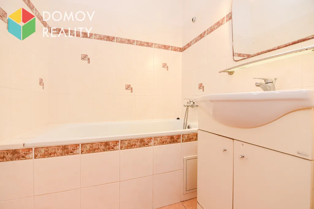 - Koupelna s vanou, umyvadlem a zrcadlem.