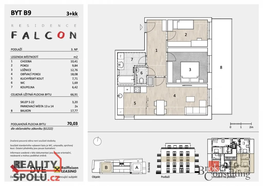 Uvedená cena zahrnuje variantu bytu ve standardním finálním provedení. Součástí je sklep (3,2 m²) a prostorný balkon (17,77 m²), jež je přístupný ze všech třech místností.