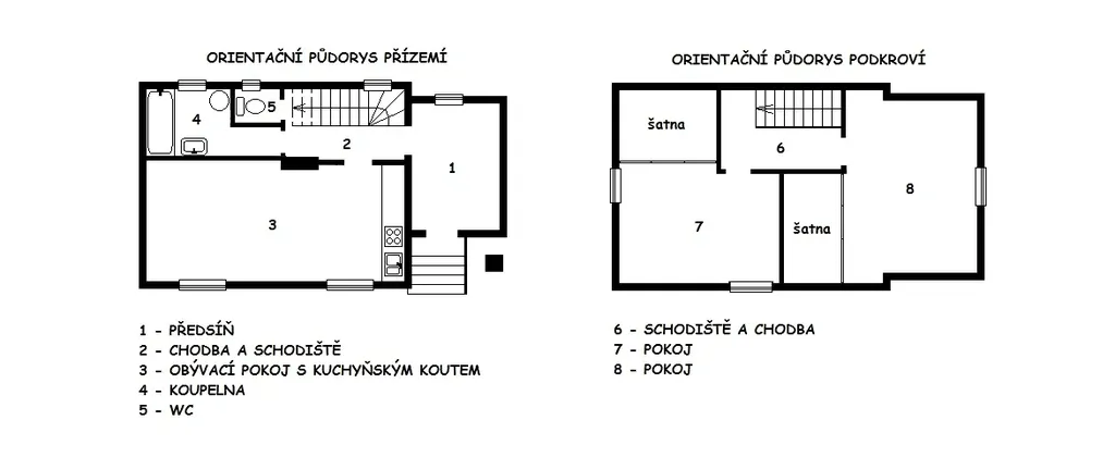 V podkroví jsou dva prostorné samostatné pokoje, oba s praktickou vlastní šatnou.