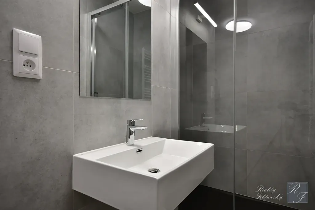Rekonstrukce bytu byla právě dokončena zkušenou realizační firmou a zahrnovala vše od nivelace podlah, vyzdění obou jader, vodoinstalaci, odpady, vzduchotechniku i elektroinstalaci zakončenou revizní zprávou. Na hlavní i druhou kuchyňskou linku (kterou můžete, ale nemusíte instalovat) jsou připraveny všechny přípojky elektřiny i přívody vody a odpadu tak, aby budoucího vlastníka při návrhu kuchyně nijak neomezovaly a zajistily dodržení platných norem. Kuchyňské linky nejsou součástí nabídky a nový vlastník si je řeší dle svých potřeb.