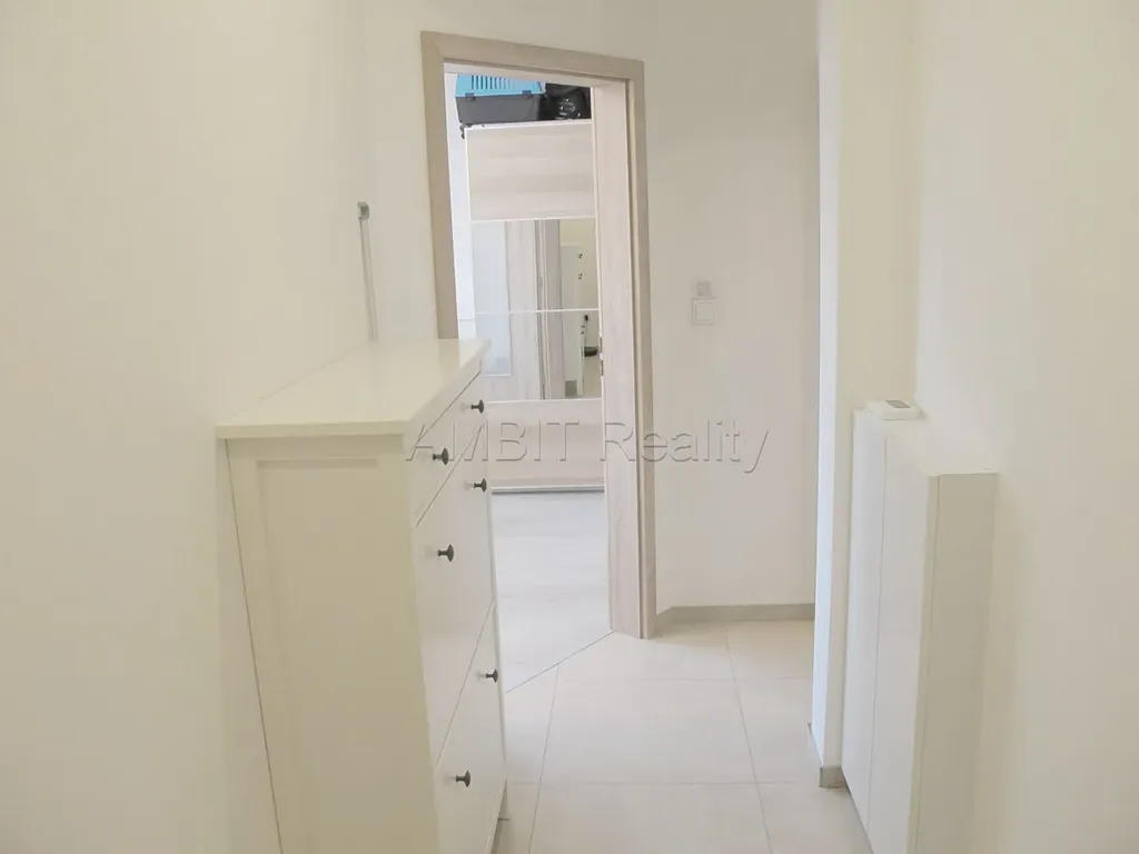 Byt sestává z menšího pokoje s kuchyňským koutem (kuchyň, nebo menší obývák) a druhého většího pokoje (ložnice, nebo větší obývák), dále byt sestává z koupelny s WC, předsíně a úložné komory v půdní vestavbě. Byt se prodává nezařízený, k dispozici zůstane vybavená kuchyňská linka a šatní skříně v ložnici. Kuchyňský kout je vybavený moderní kuchyňskou linkou se spotřebiči (sklokeramická indukční varná deska, elektrická pečicí trouba, samostatně stojící lednice s mrazákem). Z jednoho pokoje je výhled do klidného zeleného vnitrobloku a z druhého do dálky na celou Prahu. V koupelně se nachází umyvadlo, zděný prostorný sprchový kout, WC a přípojka na pračku. V koupelně a předsíni je podlahové topení.