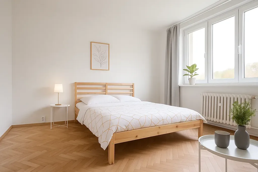 Dispozice bytu nabízí prostorný obývací pokoj s přístupem na balkon, samostatnou ložnici, kuchyň, koupelnu, WC a vstupní chodbu. K bytu náleží sklepní kóje.