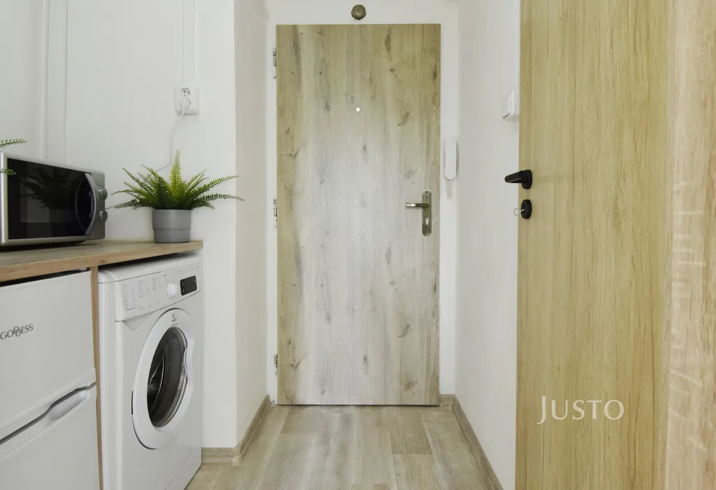 Předmětem pronájmu je garsoniéra o výměře 22 m², která byla před šesti měsíci rekonstruována. Jedná se o menší byt, ve kterém je ale vše, co od tohoto typu bytu budete potřebovat. V pokoji je k dispozici kuchyňská linka s elektrickým vařičem. V předsíni je umístěna pračka, lednička s mrazákem a mikrovlnka. V koupelně je menší vana, toaleta, umyvadlo se skříňkou a zrcadlem. K bytu náleží sklepní kóje v suterénu domu. Byt může využívat také společnou lodžii v mezipatře.