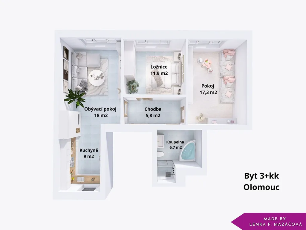 Moderní byt 3+kk s krbem, podlahovým topením a rekuperací– Olomouc, Pavlovičky.