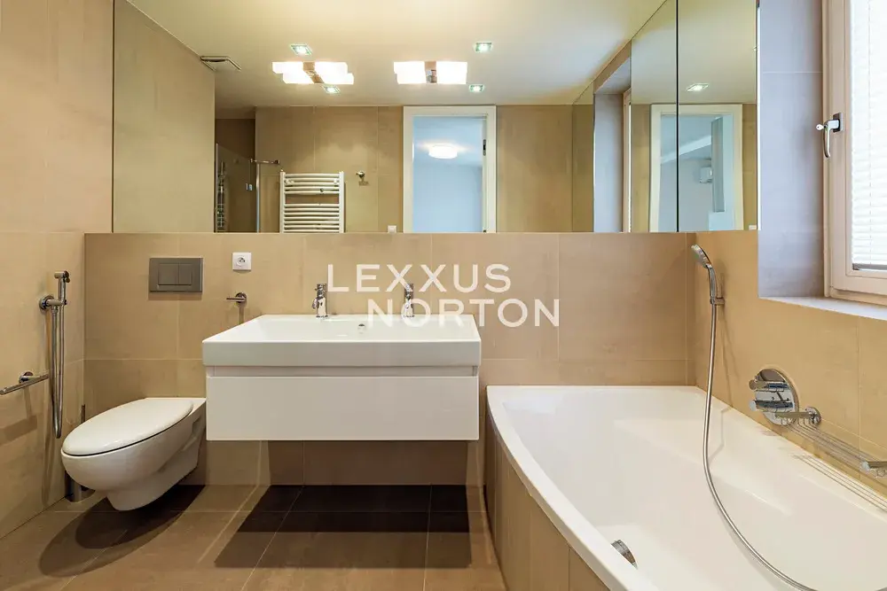 Kuchyňský kout je vybaven sporákem, myčkou nádobí, troubou, mikrovlnnou troubou, lednicí, mrazákem a digestoří. V obývací místnosti, kuchyni a koupelnách je podlahové topení a ve všech pokojích klimatizace. Byt dále disponuje bezpečnostními dveřmi, vestavěnými skříněmi a prosklenými stěnami. Koupelny jsou vybaveny vanou, sprchovým koutem a bidetem. Součástí bytu je také pračka a sušička.