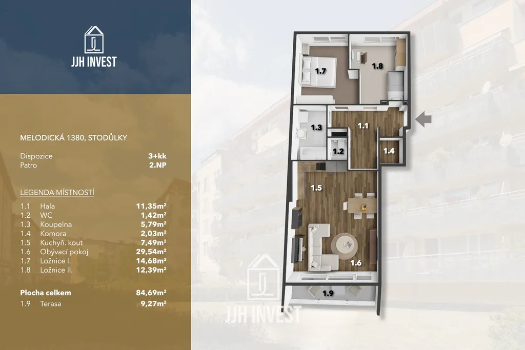 Nabízíme k prodeji prostorný a kompletně vybavený byt 3+kk o velikosti 84,69 m² s terasou 9,27 m² a dvěma garážovými stáními přímo v domě v oblíbené rezidenční lokalitě Praha 5 – Stodůlky, ulice Melodická.