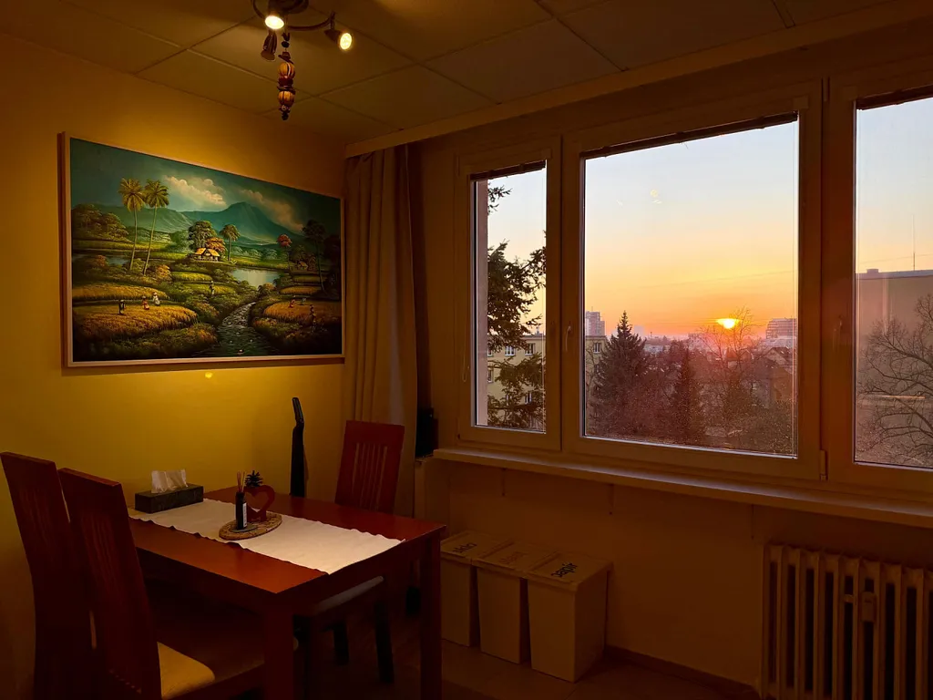 - Komfortní dispozice: Byt nabízí dvě neprůchozí ložnice, obývací pokoj s kuchyní na míru a balkón orientovaný na jihozápad s výhledem na panorama Prahy a západy slunce. Poskytuje tak dostatek soukromí pro rodinu, pracovnu či hosty.