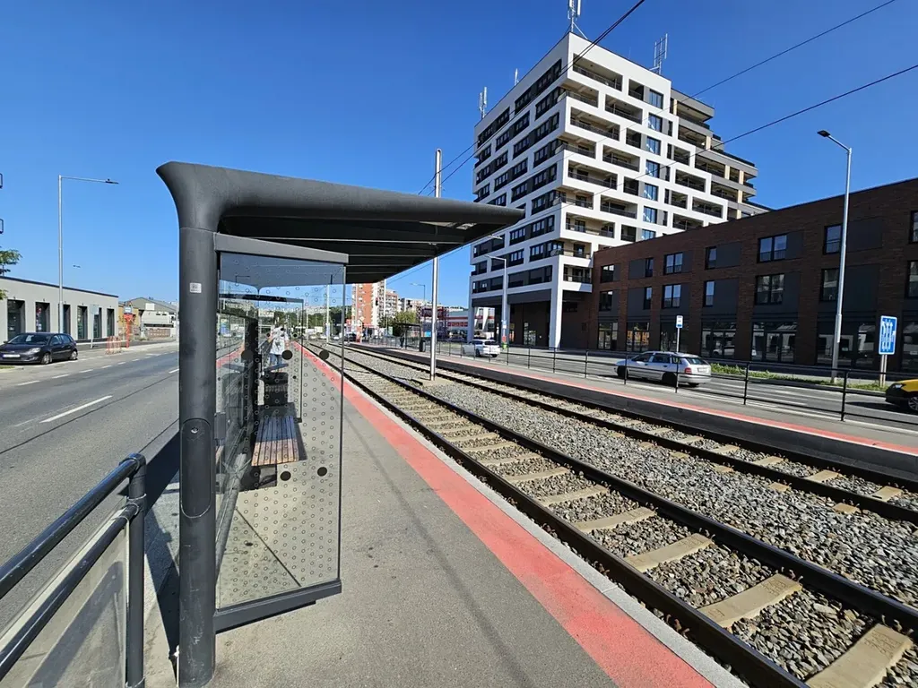 Zastávka tramvají Nademlejnská u domu, metro B - Hloubětín dvě zastávky tramvají.