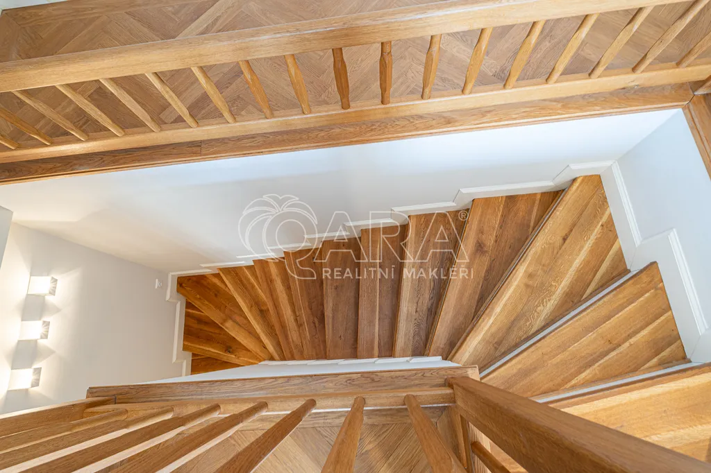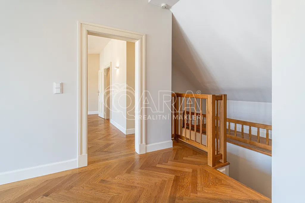 Horní úroveň (podkroví) slouží jako klidová zóna se dvěma ložnicemi a vlastní koupelnou. Ta je nadstandardně vybavena vanou, dvěma umyvadly, bidetem a toaletou, k dispozici je zde i pračka a sušička. Jedna z ložnic disponuje vlastní šatnou, druhá je klimatizovaná a nabízí přímý vstup na terasu (8,9 m²) s výhledem na Pražský hrad a střechy Starého Města. Byt má vlastní vytápění zajištěné plynovým kotlem. Na podlahách jsou dubové parkety.