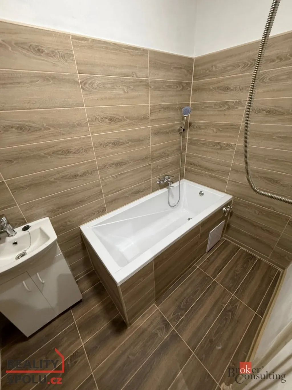 Koupelna: Zděné jádro, nová vana, elegantní obklady a příprava na pračku.