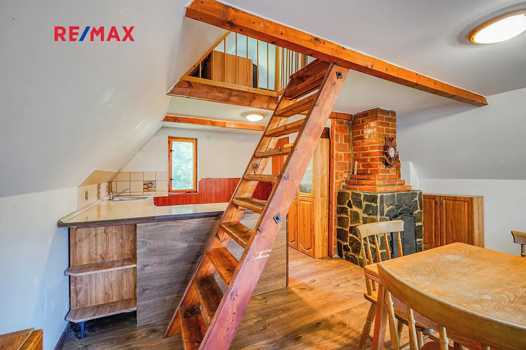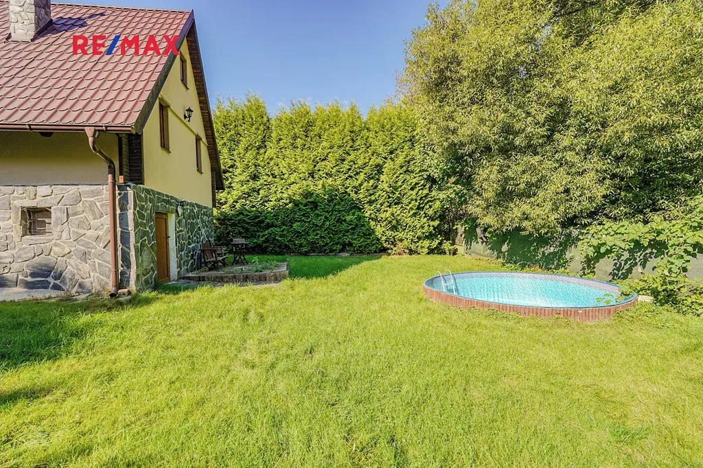Dům je rozdělen do tří podlaží, v 1. podlaží se nachází vstupní chodba a místnost kterou lze využít například jako dětský pokoj. Ve 2. podlaží se nachází obývací pokoj s krbem, kuchyní a koupelnou se sociálním zázemím. Ve 3. podlaží nalezneme další pokoj který lze využít například jako dětský pokoj, ložnici a nebo pracovnu. Dále je na zahradě k dispozici polozapuštěný bazén a domek pro zahradní náčiní. Díky vysokým vzrostlým stromům po obvodu pozemku nabízí zahrada dostatek klidu a soukromí. Dům prošel v roce 2016 kompletní rekonstrukcí včetně zateplení, je vybaven plastovými okny s dvojskly, elektroinstalací kompletně v mědi, plovoucími podlahy a střechou z plechové taškové krytiny. Vytápění je zde řešeno pomocí krbu a ohřev vody pomocí elektro bojleru.