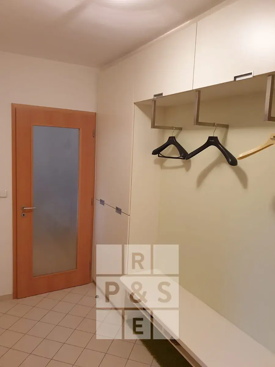 Prostorný obývací pokoj s kuchyňským koutem vybaveným moderní kuchyňskou linkou s vestavnými spotřebiči a TV stěnou v obývací části. Dvě ložnice jsou vybaveny vestavěnými skříněmi. Prostorná komora s vestavěnými skříněmi a oknem může sloužit jako pracovna či studovna pro děti. K dispozici je koupelna s vanou a WC, samostatné WC a předsíň s vestavěnými skříněmi.