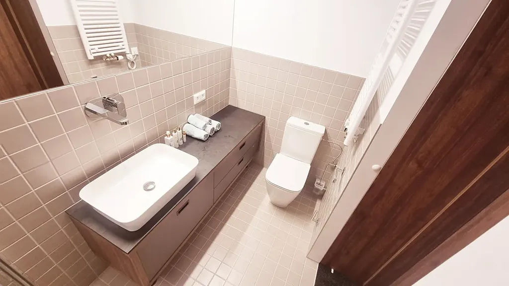 V koupelně (3,5 m²) je sprchový kout, umyvadlo se skříňkami, toaleta a otopný žebřík.