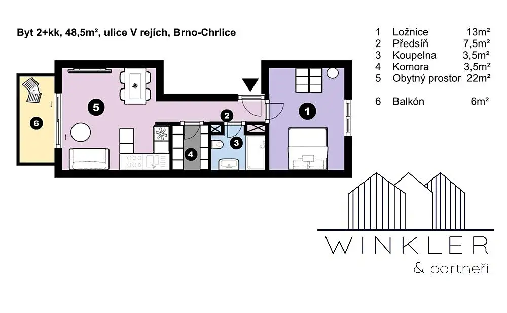 K dlouhodobému pronájmu vám nabízíme nový, klimatizovaný byt, o dispozici 2+kk, s nadstandardním řešením a vyhrazeným parkovacím stáním, na ulici V rejích, v klidné lokalitě, malý kousek od centra, v Brně-Chrlicích.